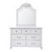 The Alana 7-Drawer Dresser & Mirror is the perfect addition to your little ones bedroom! This horizontal dresser comes with seven, spacious drawers; perfect for keeping all of your belongings neatly stored away. The four bottom dressers are the perfect size for storing away more bulkier items, like sweaters. The portrait mirror features an intricate molding at the top, adding extra style to this already chic set. The crystal-like drawer handles and knobs pair beautifully with the clean, white finish. Bevel edges and cabriole feet complete the look of this transitional design. Features: • Built in Drawer Stop Safety Feature • Intricate Moldings • Crystal Handles and Knobs Dimensions: Depth: 17.0" x Width: 56.0" x Height: 81.0" Weight: 155.0 lbs.