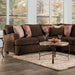 Nothing says home like a nice earth-tone piece. The warmth that this sectional brings may be attributed to its daring color theme: the base chenille fabric is in dark brown accentuated with pops of orange and rustic hues found in the throw pillows. But the inviting feeling is more than skin-deep; it also features classic elements of the English sofa pleated, curved low arms and traditional T-cushions which are known for the welcoming comfort they provide.