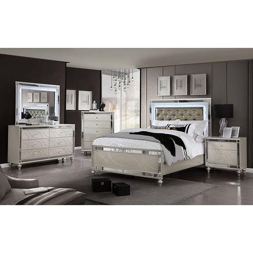 Update your bedroom with sleek contemporary styling and design. The bed features a padded leatherette headboard. Matching chest, dresser, night sta...