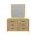 Enhance your bedroom with the stylish Ridgemont Dresser & Mirror Set. Finished in a light tone with natural grain detailing, this piece brings warmth and elegance to any space. Sleek, rounded edges and vertical reeding throughout create a modern yet refined aesthetic. The dresser & mirror set features a black felt-lined top drawer, providing protection and organization for your essentials. Spacious drawers, accented with bold black bar pulls, offer ample storage. With clean, minimalist lines, the Ridgemont Dresser & Mirror Set combines function and contemporary design, making it an ideal addition to your bedroom. Features: • Light Wood Finish with Natural Grain Detailing • Sleek, Rounded Edges for a Soft, Modern Look • Vertical Reeding Throughout for Added Texture and Depth • Black Felt Lined Top Drawer for Added Protection and Organization • Spacious Drawers with Black Bar Pulls for Contrast • 62"W x 16"D x 77"H • Due to lighting, product color may slightly vary from images. Dimensions: Depth: 16.0" x Width: 62.0" x Height: 77.0" Weight: 232.0 lbs.